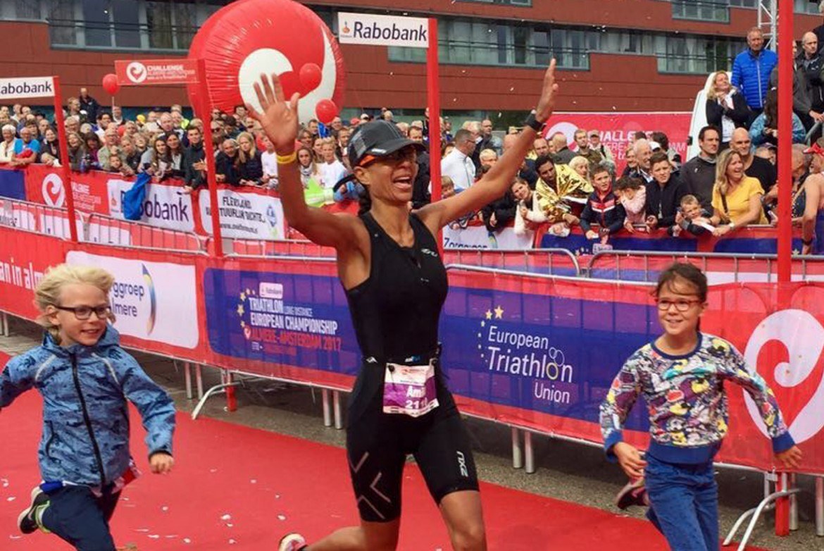 Mijn ademhaling gaat omhoog en mijn knieën doen pijn. Ik druk door. Bij iedere stap hoor ik de muziek en het gejuich luider worden. Dit zijn mijn laatste minuten. Als in een film flitsen memorabele momenten, die ik heb beleefd om hier te komen, voorbij. Hoe ik met 13 graden in de gracht ging zwemmen ter voorbereiding op mijn tweede sprint triatlon. Hoe ik tijdens een mijn eerste buitenrit in maart met mijn racefiets viel omdat ik was vergeten dat ik vast zat aan mijn pedalen. Finishen op een Triatlon Half Distance was al die maanden een stip op de horizon. Nu zo dichtbij dat ik het bijna kan aanraken. Overmand door emoties beginnen mijn wangen te gloeien en stromen er dikke tranen over. Een lang gekoesterde droom wordt werkelijkheid. De tegeltjeswijsheid ‘alles is mogelijk als je maar durft’ klopt. Met het laatste beetje kracht zet ik nog eenmaal een versnelling in. Bij de laatste bocht staat Amélie op mij te wachten. Zij rent de laatste meters met mij mee. ‘Kom op mama’! Daar is de finish. Mijn handen gaan de lucht in en heb een glimlach van oor tot oor. Onder luid applaus ren ik over de finishlijn. Wankelend op mijn benen neem ik de medaille in ontvangst. Een van de vrijwilligers wikkelt me in folie. Ik kan alleen maar huilen. Tranen van verbazing, trots, geluk en opluchting. Mijn eerste Triatlon Middle Distance is een feit. Eindelijk durf ik te zeggen; ik ben een triatleet.