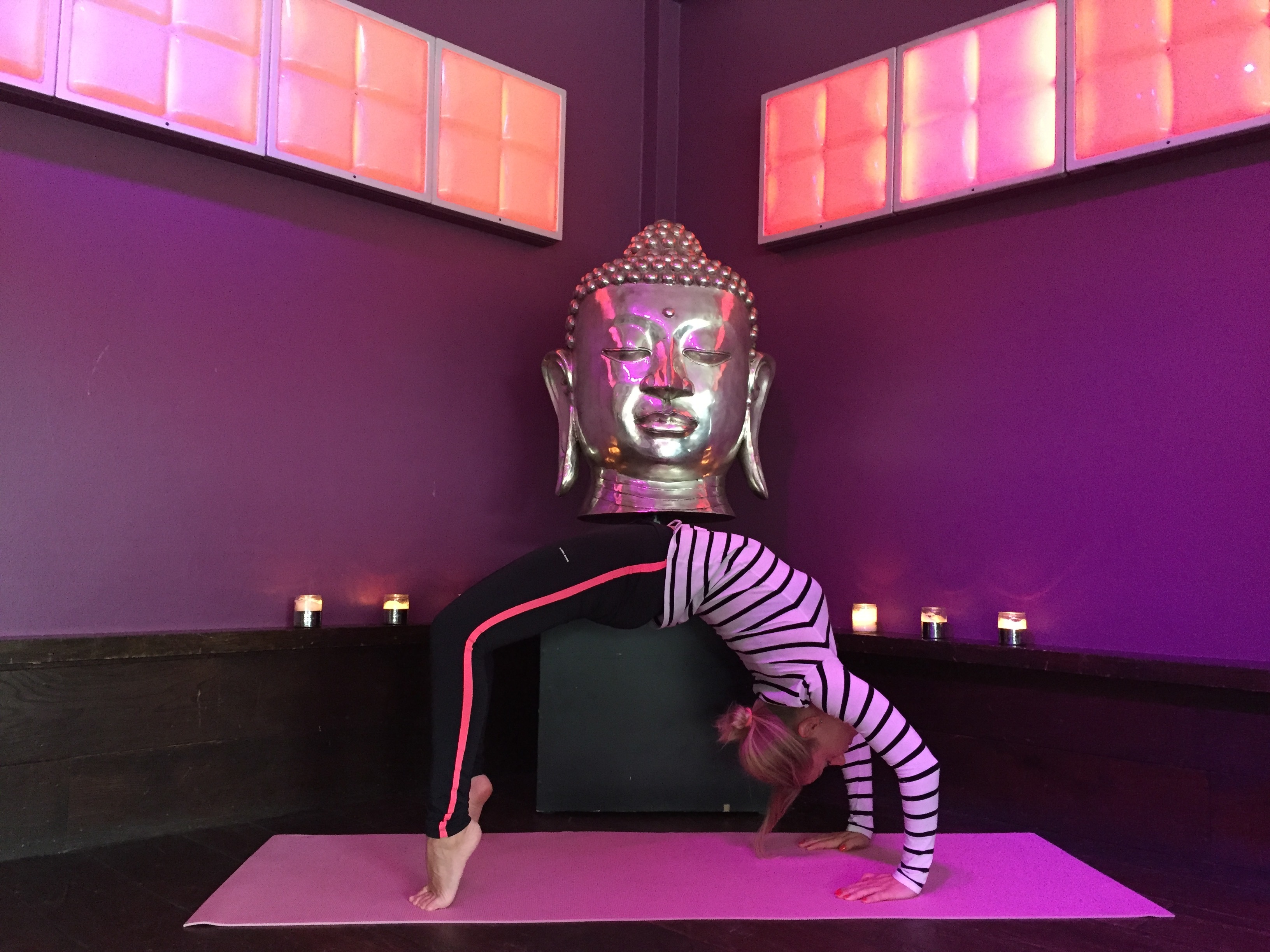 Dit is een gevorderde omgekeerde achteroverbuiging. In yogajargon heet deze houding “Urdhva dhanurasana”. Urdhva betekent ‘opwaarts’ en ‘dhanu’ is boog. In deze pose is er een strekking van de gehele wervelkolom. Naast de wervelkolom zijn ook de spieren en gewrichten van de benen en armen actief. Waarbij het heupgewricht een belangrijke rol heeft. Deze zorgt er namelijk voor dat je van de grond kan komen. De strekking die ontstaat brengt ruimte in de borstkas en daardoor is het mogelijk om dieper te ademen.