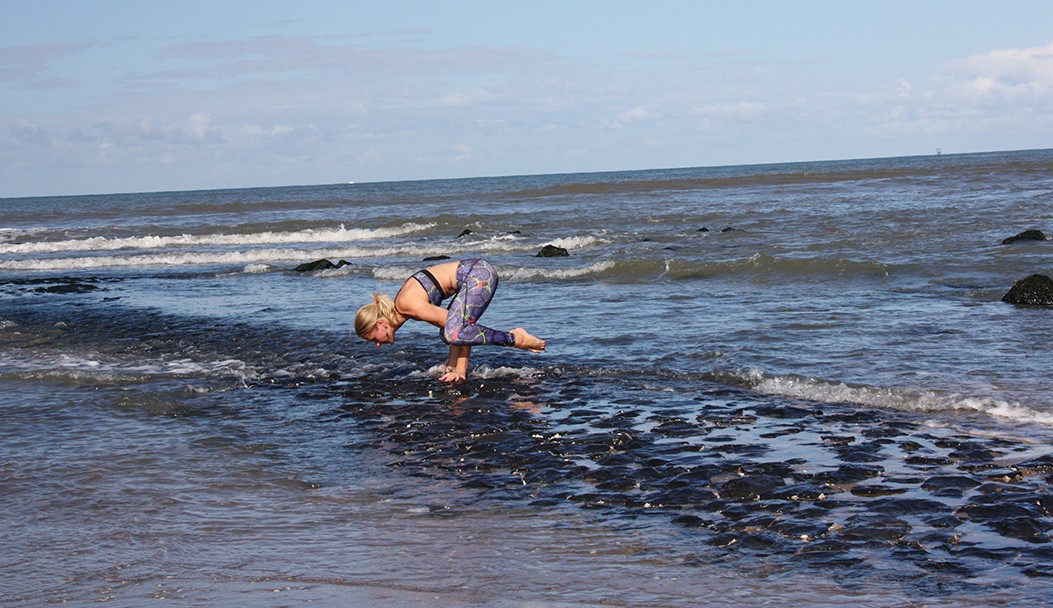 Dit is een gevorderde armbalanshouding. In yogajargon heet deze houding “Bakasana”. Baka betekent kraanvogel, reiger. In deze asana worden met name de wervelkom, benen en armen gebruikt. Om de buiging met de werkvelkolom te kunnen maken zijn de kleine lendenspier, de buikspieren en de bekkenbodem actief. Ook de nekspieren zijn actief om de nek gestrekt te houden. De lenden- en heupbeenspier buigen de heupgewrichten en de hamstrings zorgen ervoor dat de kniebuiging gehandhaafd blijft. Met name de triceps werken tegen de zwaartekracht in om deze asana te blijven. En ook de spieren in de hand zorgen ervoor dat de boog van de hand behouden kan blijven. Kortom, er zijn vele spieren en gewrichten tegelijkertijd actief in de Kraanvogel. De grote uitdaging zit niet zo zeer in de kracht van de spieren als wel in het vinden van voldoende focus om de balans te bewaren.
