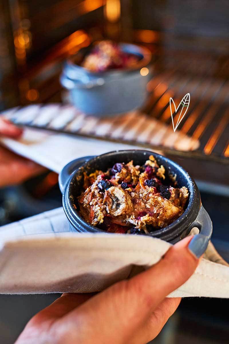 ‘Elke ochtend maak ik de half baked happy oats. Dat geeft wel aan hoe gek ik ben op dit ontbijtje. Het is makkelijk voor te bereiden en staat ongeveer 20 minuten in de oven. De keuken ruikt altijd zo lekker. Ik weet zeker dat jullie dit ook een topper vinden!’