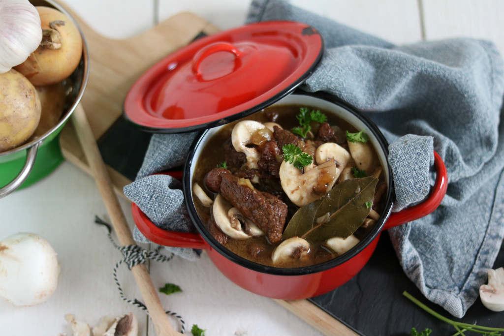 Jaren geleden heeft zij mij het stoofvlees recept gegeven. Het is een familierecept dat al 30 jaar op tafel komt. Op één of andere manier ben ik dit kwijtgeraakt. Gelukkig heb ik nu een nieuw handgeschreven versie, die ik niet meer weggooi. Het bijzondere aan dit recept is de toevoeging van rozijnen, bruin bier en champignons. Zo krijg het draadjesvlees een zalige combinatie van zout en zoet.