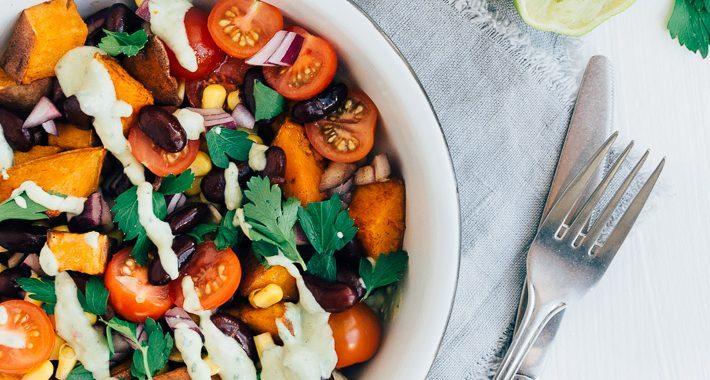 Goed, die Mexicaanse twist. Met wat maïs, kidneybonen en avocado kom je al een heel eind. Daarnaast gebruik ik graag komijn en chipotle als ik op de Mexicaanse tour ga. Dat laatste is een smokey peper en die is best pittig, gebruik dus niet teveel. Kan je dit niet vinden, dan kan je ook een beetje gerookt paprikapoeder gebruiken. Dat is Spaans, maar niemand die dat proeft. Ik heb de zoete aardappel even geroosterd, maar koken kan eventueel ook. Hoe kleiner je de blokjes snijdt, hoe eerder ze klaar zijn en des te sneller kan jij aan tafel. Dat vind ik altijd wel een plus voor een doordeweekse dag. Want uren in de keuken staan heeft niemand tijd voor na een lange dag werken. Ik wilde een romige dressing maken en de avocado is daarvoor een perfecte basis. Heerlijk bij elkaar!