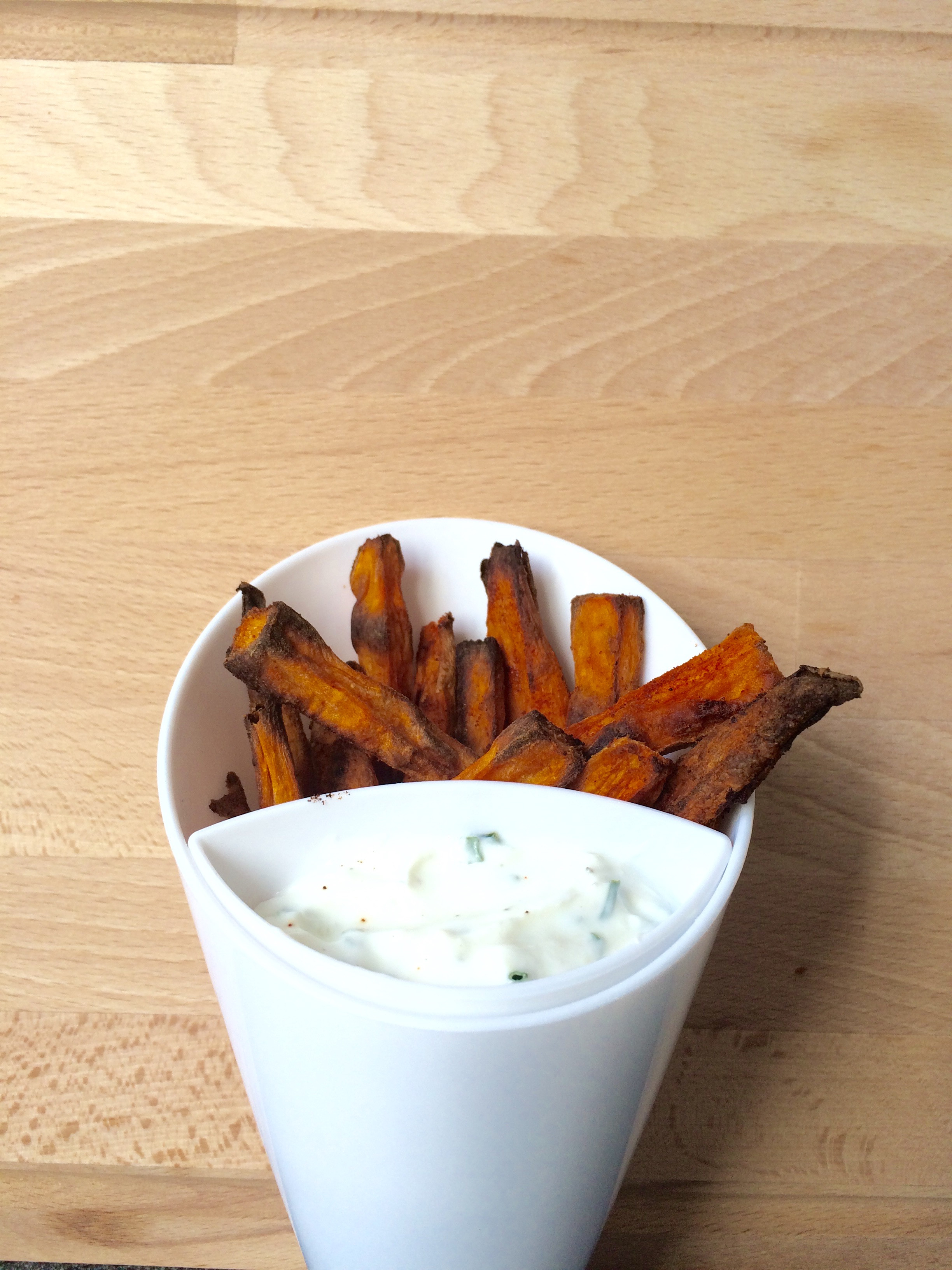 Was de zoete aardappel goed schoon en snijd deze in de vorm van frietjes.