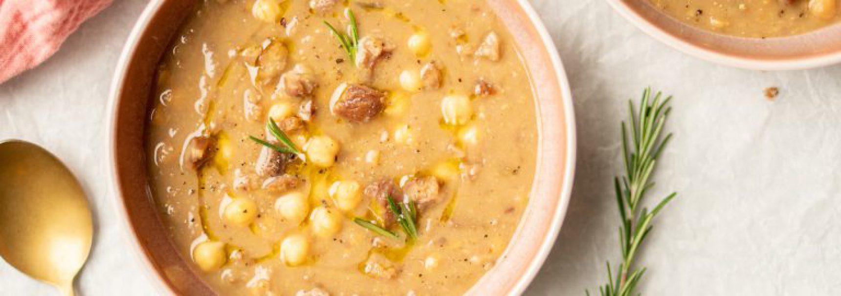 De Italianen maken deze soep in verschillende varianten, schrijft ons zusje Culy, maar de combinatie kikkererwten en kastanjes is een constante. Een heel lekker vullend soepje (het is een volwaardige maaltijdsoep dankzij de kikkererwten) zodat je er weer even tegenaan kunt.