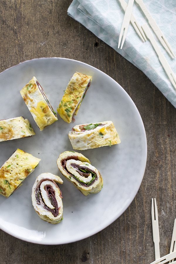 Op ons vorige feestje maakte ik daarom omeletrolletjes met rookvlees. Een succes, want ook deze hapjes vlogen weer van de schaal. Daarom deel ik hem graag met jullie.