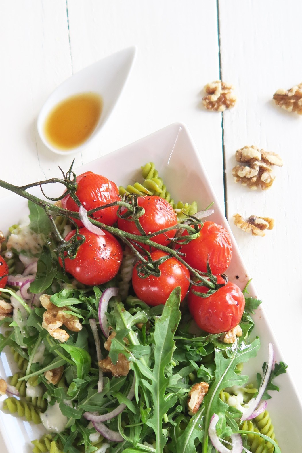 Om de pasta een extra smaakdimensie te geven maak je hem af met een scheutje notenolie. Dit past echt héérlijk bij geitenkaas en rucola door de nootachtige smaak. Wisten jullie dat één theelepel notenolie per dag een positieve werking heeft op je concentratie vermogen? Ik gebruik in dit recept sesamolie, maar je kunt ook walnootolie gebruiken.