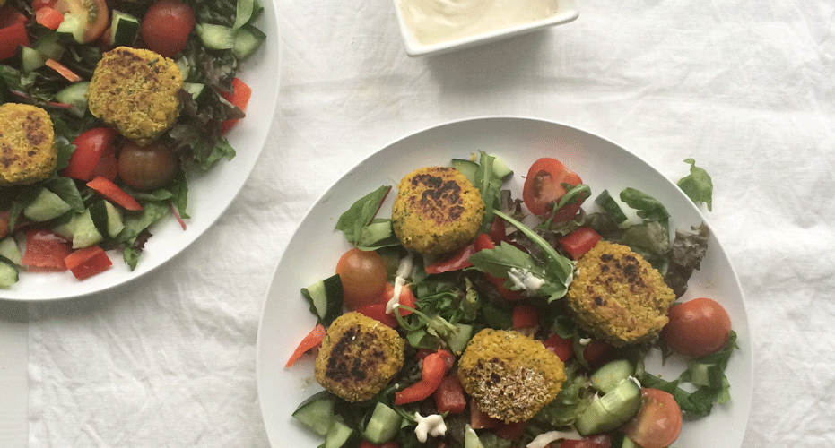 Falafel wordt gemaakt van kikkererwten met verschillende soorten kruiden en specerijen, soms in combinatie met tuinbonen. Het zijn een soort mini kikkererwten burgers. Heerlijk door een salade of in een wrap met een homemade sausje. Meestal wordt falafel geserveerd met een tahin, yoghurt, of humus dip.