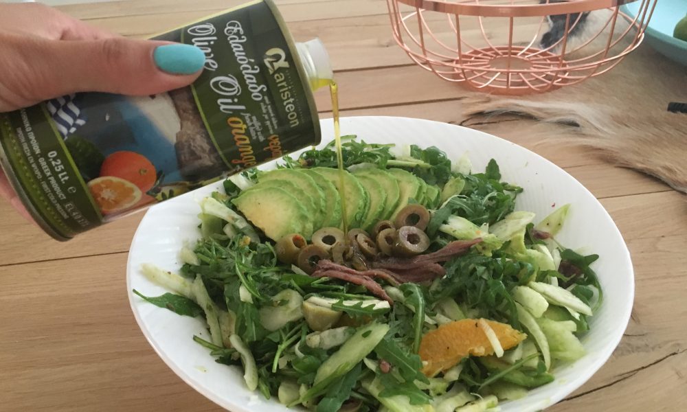 Bij dit recept is het echt less is more. Je hebt namelijk helemaal niet zoveel ingrediënten nodig om iets te maken dat fantastisch smaakt. Voor deze salade gebruikte ik olijfolie met sinaasappel die ik op Zakynthos gekocht had. Normaal gesproken hou ik niet zo van producten met sinaasappelsmaak, maar deze olie is anders. Tijdens het proces zijn de sinaasappel meegeplet, waardoor de smaken echt in elkaar verweven zijn. Heaven on earth! Ik durf niet te zeggen of de olie in de supermarkt verkocht wordt, maar ik vond deze webshop die een soortgelijk product verkoopt. Mocht je geen sinaasappel-olijfolie hebben dan maak je gewoon zelf een dressing door de olie met wat versgeperst sinaasappelsap te mengen, net zo makkelijk =)