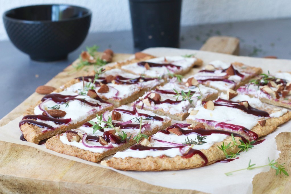 De kunst om de bodem knapperig te krijgen is door het havermoutbeslag zo dun mogelijk over een een bakplaat (met bakpapier) te smeren en hem daarna knapperig te bakken in de oven. In de laatste minuten beleg je hem met de ingrediënten, waarna je hem nog even in de oven schuift. Terwijl de bodem in de oven zit kun je je mooi richten op misschien wel het lekkerste van het hele gerecht; de stroop van rode wijn! Klinkt misschien ingewikkeld, is het niet. Een goede rode wijn, wat honing en maïzena is all it takes. Heb je nog wat wijnstroop over na de flammkuchen? Dat is alleen maar fijn want deze stroop smaakt ook méga lekker over salades, broodjes met hüttenkäse, crackers met avocado of over toastjes met gerookte kip.