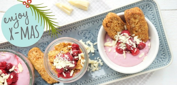 Yes, het is tijd voor de toetjes uit het kerstmenu! Of zal ik nu maar desserts, of nagerecht zeggen? Beetje sjieker mag wel, toch? Want dit zijn niet zomaar toetjes, dit zijn wel gerechtjes waar je even de keuken voor in moet. En waar je indruk mee gaat maken! Maar toch is dit wel een typisch Mind Your Feed toetje, want al te moeilijk is het niet en je kunt deze frambozenmousse met amandelkoekjes al bijna helemaal van tevoren klaar maken. Eigenlijk moet je dan dus een hele ontspannen kerstdag hebben, want ik heb er in alle gerechten rekening mee gehouden dat je niet de hele middag in de keuken hoeft te staan of in elk geval alvast wat dingen kunt voorbereiden. Dussss, tijd voor het nagerecht!