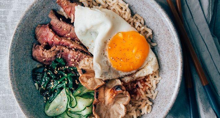 Voor het maken van deze bibimbap begin je met het opzetten van de rijst. Daarna maak je de ingelegde komkommer. Snijd daarvoor de komkommer in dunne plakjes en leg ze in een kommetjes waarover je rijstwijnazijn met suiker giet. Het volgende onderdeel zijn de dunne plakjes biefstuk. Hiervoor bak je een biefstuk mooi bruin in de pan, je laat het even rusten voordat je het in dunne plakjes snijdt. Roerbak dan snel de spinazie met een beetje zout. Dit doe je heel kort, zo blijft de spinazie super lekker. Intussen bak je een eitje. Het is allemaal bij elkaar heel erg lekker met een beetje chilisaus.