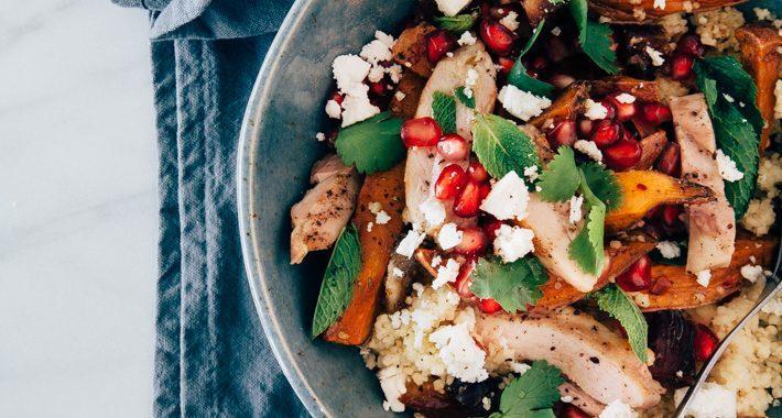 Verder is het niet zo ingewikkeld. Je bakt de kip mooi bruin in de pan (of grillt hem, wat je voorkeur heeft), hakt de dadels in kleine stukjes, mengt alles door de couscous samen met wat olie en citroensap, voegt dan lekker frisse verse kruiden als munt en koriander toe en bestrooit de salade tot slot met de granaatappelpitjes en verkruimelde feta.