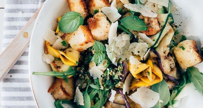 Bij deze gegrilde groenten salade heb ik ook nog een snelle salsa verde gemaakt (kruiden, olijfolie en kappertjes) die je heerlijk als dressing kunt gebruiken. En in zelf gemaakte croutons van in de pan gebakken blokjes brood met kruiden!