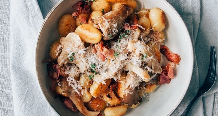 Er is wel een maar. Wanneer je de gnocchi niet goed na het koken afspoelt blijven ze tijdens het bakken aan de pan vastplakken. Dit komt door het zetmeel wat in de gnocchi zit. Het hecht zich vast aan de pan. Wanneer de gnocchi net in de pan ligt en een klein beetje aanbakt, denk je dat het nog wel te redden is, maar vergeet het maar! Overweeg dus geen shortcut, goed afspoelen dus die gnocchi! Ik heb natuurlijk zelf wel een keer die shortcut genomen, anders kan ik het je niet zo goed vertellen. Het is om heel verdrietig van te worden dus begin er niet aan!