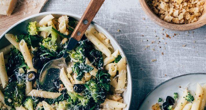 Het is een vegetarisch pastarecept, om de saus een beetje pit te geven gebruik ik zwarte olijven. De pastasaus maak je door de broccoli samen met de pasta in één pan te koken. In bouillon. Dit geeft zoveel smaak aan de pasta en de broccoli. De andere ingrediënten (fijngesneden knoflook, olijven en stukjes courgette) bak je in een koekenpan met olijfolie. Als laatste voeg je de spinazie toe totdat deze is geslonken . Meng de pasta en de broccoli in de pan met de groene groentes en bestrooi dit met wat knapperig gebakken broodkruim en kaas (de broodkruim bak je vooraf met wat olie en knoflook in de de koekenpan). Het is overigens niet echt een gladde pastasaus. Maar omdat de broccoli wat gaarder gekookt wordt dan normaal, valt hij uit elkaar en dan krijg je een saus-achtig effect. Je kunt voor dit recept van die leuke schelpjes of oortjespasta (orecchiette) gebruiken, of net als mij penne. Of je vult van die mooie grote pastaschelpen met de groentesaus en wat extra kaas.. Ook heel leuk en lekker!