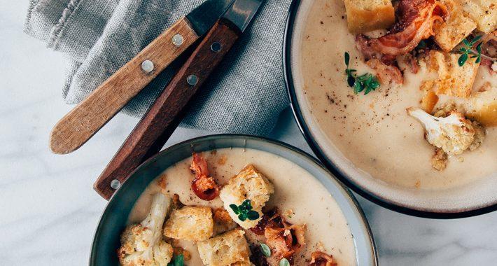 Om de bloemkoolsoep extra romig te maken kook ik de bloemkoolroosjes en aardappels gaar in melk en bouillon. Wanneer je de verse geitenkaas hebt toegevoegd kun je alles gemakkelijk met de staafmixer pureren. Extra lekker wordt deze romige bloemkoolsoep met de topping van croutons en ontbijtspek.