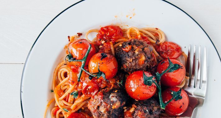 Het hele recept is gemaakt van ingrediënten uit je voorraadkast. Ik bedoel, uit mijn voorraadkast. Natuurlijk heeft niet iedereen standaard ansjovis of een pot met geroosterde paprika’s klaarstaan. Misschien moet je ook voor de gehakt even de deur uit! Maar toch denk ik dat ook jij een heel eind komt met voorraadspulletjes! Kortom een perfect spaghetti met gehaktballetjes recept wanneer je geen zin hebt om nog naar de super te gaan, en geen zin hebt om eten te gaan halen of te bestellen. En zo’n tomatensaus met geroosterde paprika’s is echt in een kwartiertje gemaakt. Lekker zoet en toch een beetje zurig! Wie weet heb jij net als mij straks ook een ijzeren voorraad met tomaten in blik!