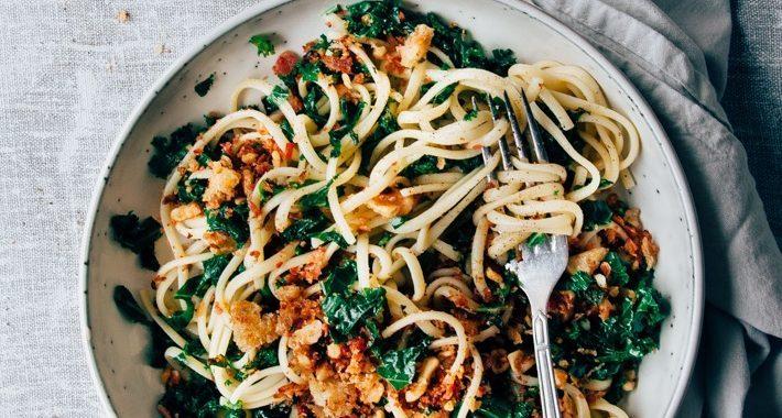 Boerenkool heeft een wat noterige smaak, die je totaal niet ontdekt wanneer je er een lekkere stamppot van maakt en er een rookworst bij serveert. Maar wanneer je boerenkool geroerbakt eet merk je het ineens. Walnoten passen daarom ook perfect bij dit boerenkool recept. Ik hak ze grof, samen met het brood tot een soort crumble. Daarna bak ik alles nog even in de pan met wat olie, omdat je eerst de pancetta in de pan hebt gebakken krijgt het broodkruim de smaak van het spek. Dan voeg ik alles bij elkaar. Zo’n crumble mengt zich goed door de tagliatelle zodat je bij elke hap walnoten, boerenkool en pancetta proeft.