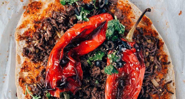 Het is ook nog eens heel snel gemaakt. Het Turkse brood besmeer je met zelfgemaakte pesto van gegrilde paprika’s, amandelen en pistache nootjes. Je kunt je in de keuken ‘uitsloven’ door zelf je paprika’s in de oven te grillen. Maar met gegrilde paprika’s uit een potje wordt je pesto ook heerlijk. Overigens staat het wel heel mooi twee gegrilde paprika’s bovenop de pizza. Het grillen duurt 30 minuutjes en tja de oven moet toch aan!