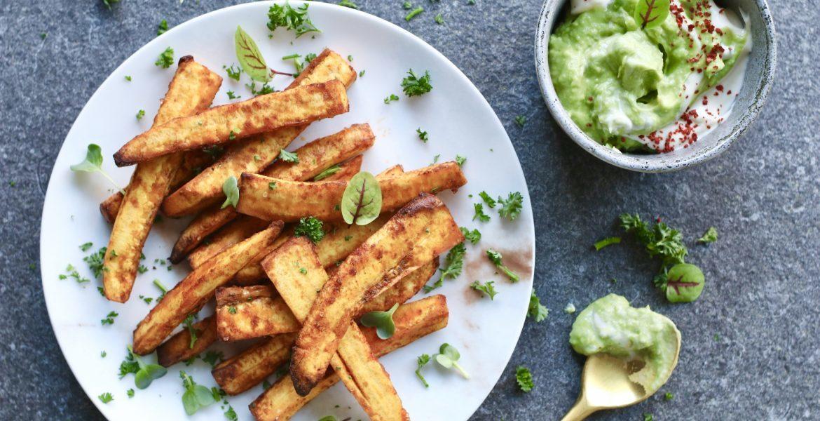 Ik vind het ontzettend leuk dat er tegenwoordig steeds meer tropische ingrediënten in de supermarkt te vinden zijn. Bijzondere fruitsoorten als dragon fruit bijvoorbeeld. En mocht je denken ‘hee dat is een gekke dikke groene banaan’ dan is dat dus een bakbanaan :D Bakbananen lijken op gewone bananen maar hebben één groot verschil en dat is de hoeveelheid zetmeel. Bananen lijken qua zetmeelgehalte meer op aardappels en daardoor (je voelt hem al aankomen) kun je daar dus héle lekkere frieten van maken. Ze hebben nog wel dat lekkere zoetje dat bananen hebben en daardoor matchen ze heerlijk met pittige kruiden en een frisse avocado-yoghurt dip. Je bakt ze gewoon in de oven dus ze zijn ook nog eens lekker gezond omdat je geen frituurvet gebruikt. Nog een pluspunt: ze hoeven maar een kwartiertje in de oven! Hoe langer je ze bakt hoe krokanter ze worden, maar na een aantal keer proberen vind ik ze het lekkerst wanneer je ze zo’n 15 minuten op 180 graden bakt. Dan zijn ze nog lekker chewy. Geniet ervan!