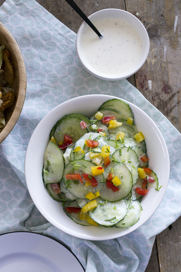 De komkommer schaaf ik het liefst in dunne plakjes, ik ben geen fan van het raspen van komkommer omdat er dan veel vocht vrij komt. En breng ik op smaak met knoflooksaus gemengd met yoghurt. De knoflook brengt de komkommer goed op smaak, maar niet te heftig. Bieslook en blokjes paprika maken de salade af. En dat was het, super simpel maar ook super lekker.