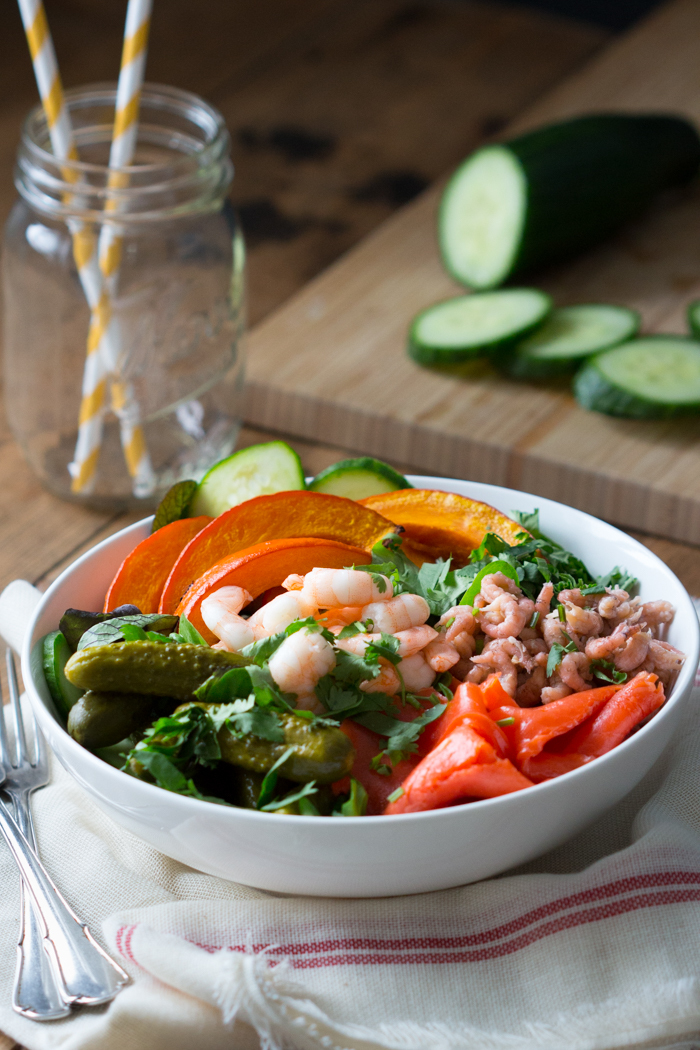 Ik besloot het allemaal te combineren in een heerlijke salade met geroosterde pompoen (daar blijf ik dol op!) en augurkjes. Mmmm! Het recept vind je hieronder. Dit is echt verrassend gemakkelijk te maken.