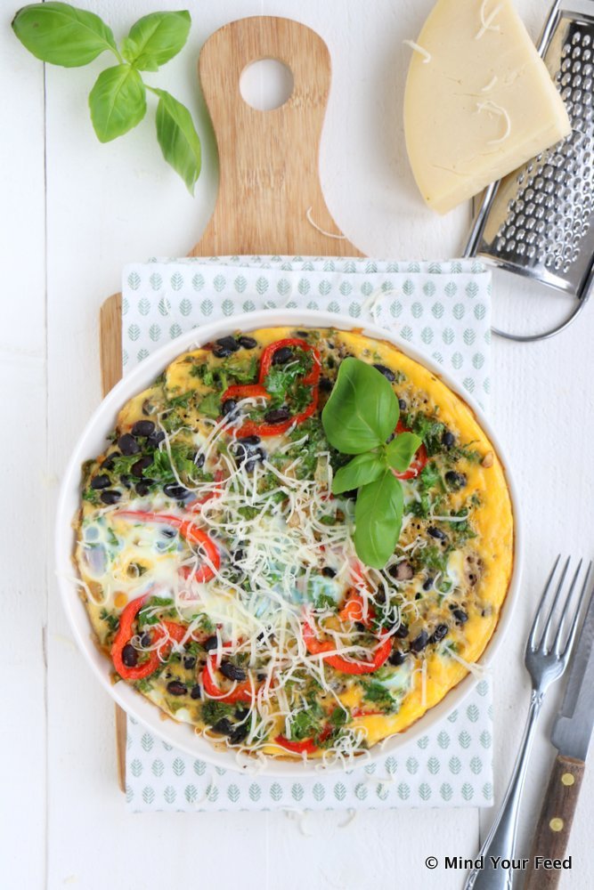 Restjeskoken. Zouden daar kampioenschappen in zijn? Want ik ben daar dus echt ontzettend goed in. Vooral voor de lunch vind ik het ideaal om wat left-overs op te maken. Dat ruimt zo lekker op in mijn toch soms overvolle koelkast. Deze frittata met boerenkool en zwarte bonen is ook een soort van bij toeval ontstaan. Met nog een beetje boerenkool en een overschot aan eieren was deze lekkere lunch zo in elkaar gezet. Lekker op een wat koudere herfst- of winterdag, want dan eet ik graag ook tussen de middag warm.
