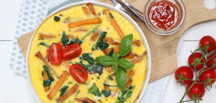 Lunchen. Het is de maaltijd waar ik eigenlijk het meeste tijd voor heb op de dag. Met mijn baan vanuit huis en een uitgebreid menu in mijn bedrijfsrestaurant zou ik natuurlijk helemaal los kunnen gaan tussen de middag. Maar toch wordt het vaak niet veel spannender dan een boterham met kaas. Want om eerlijk te zijn, eet ik vaak tussen allerlei drukke dingen door. Soms ga ik niet eens rustig zitten. Erg toch! Toen me dat vorige week weer eens pijnlijk duidelijk werd, besloot ik het anders te gaan doen. De lunch gaat mijn moment worden! En dus bakte ik voor mezelf deze frittata met spinazie en zoete aardappel. En die at ik rustig op, aan de eettafel, even echt pauze!