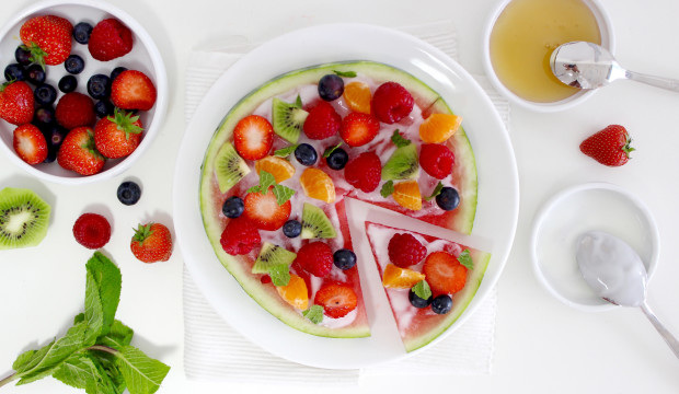 Laat ik het maar gelijk zeggen. Ik zat op de site van Marlieke van Cotton and Cream te loeren naar de bruidsjurken die ze had gepast. Ik kan er niks aan doen ik vind dat zo leuk om naar te kijken. Misschien omdat ik natuurlijk zelf nooit in een bruidsjurk zal staan. Nou ja niet om echt te trouwen, ik ben natuurlijk gek genoeg om er één aan te trekken. Anyway wat voor heerlijks naast Marlieke in bruidsjurk zag ik nog meer? Een fruitpizza! I kid you not... Ik zag uiteraard gelijk dat het niet een echte pizza van deeg was met fruit erop. Ik weet niet of ik dat lekker ga vinden namelijk. Deze "pizza' is een knipoog en een toetje en zeker leuk om te serveren als je last hebt van kinderen.