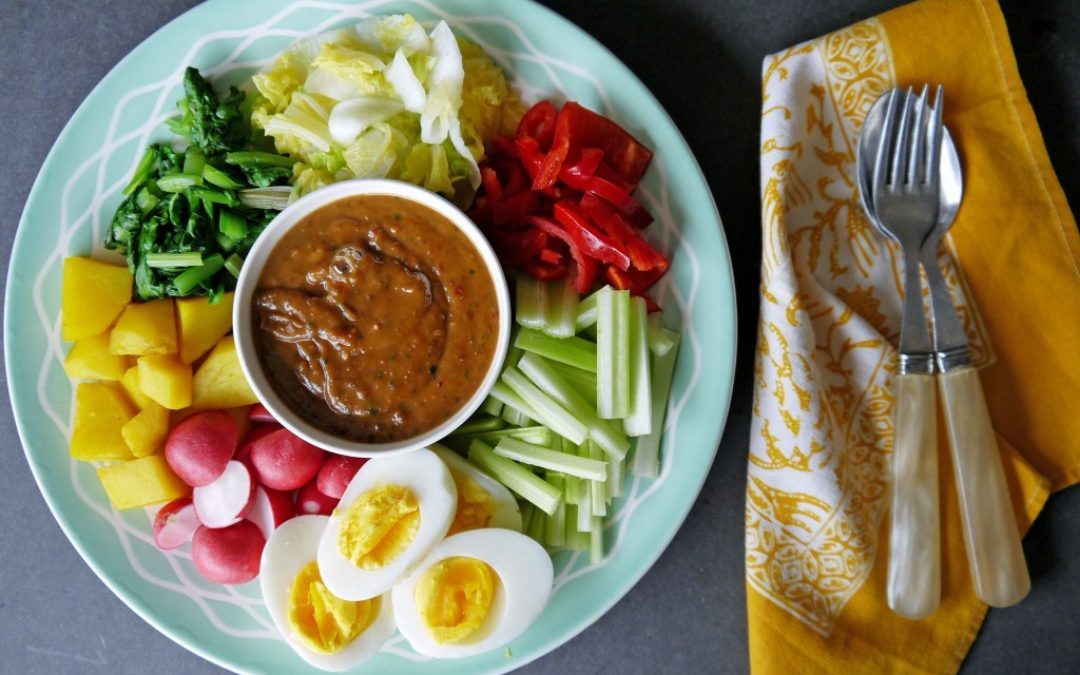 Snel, makkelijk én gezond, een combinatie waar we van houden! Deze goedgevulde Gado Gado is Indonesische comfort food, op basis van voorjaarsgroenten zoals Chinese kool, snijbiet, radijs en bleekselderij. Aardappels, eieren en pindasaus erbij op een grote schaal, en geniet van dit recept!