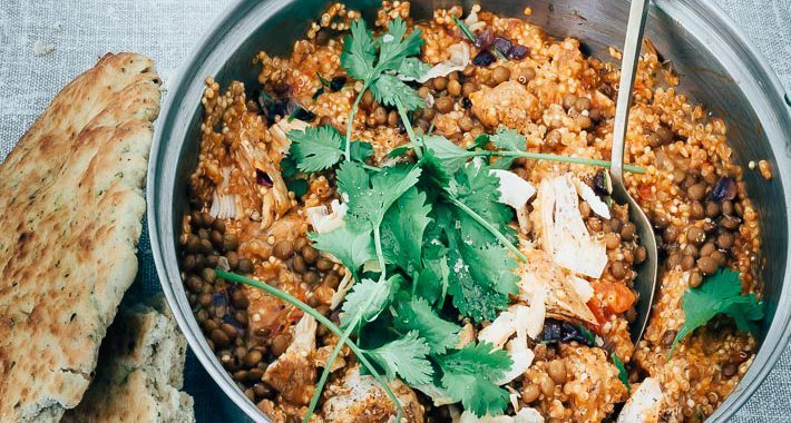 Naast de kip en quinoa heb ik ook linzen aan het recept toegevoegd. Zo wordt het echt een heel fijne volledige maaltijd. Voor de knapperigheid bestrooi ik dit garam masala kip recept met kokosschaafsel. Ik gebruik daarvoor hele grove. Die kun je kopen bij natuurwinkels en sommige supermarkten hebben het ook. Natuurlijk kan het ook met de fijnere rasp. Ook die kun je in de pan even roosteren. Het gaat wel veel sneller dan de grotere stukken dus blijf wel bij de pan in de buurt! Bij dit comfortfood recept kun je tot slot nog heerlijk een flinke lepel Griekse yoghurt serveren en er naanbrood bij geven.