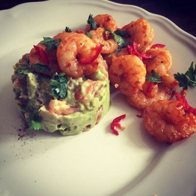 De inspiratie voor mijn recepten haal ik werkelijk overal vandaan. Magazines, internet, instagram, facebook, restaurant menu’s, etalages. Vaak als ik iets lees of zie wat ik lekker vind werkt mijn brein als in de 5e versnelling en kan ik het niet meer loslaten tot ik op de markt sta om inkopen te doen. Ik ben dan vaak bezig met het verzinnen van een smaakvolle, ‘gezonde variant’. Zo kwam ik laatst op dit heerlijke recept voor guacamole en garnalen, oftewel gebakken king prawns, een werkelijk smaak sensatie..
