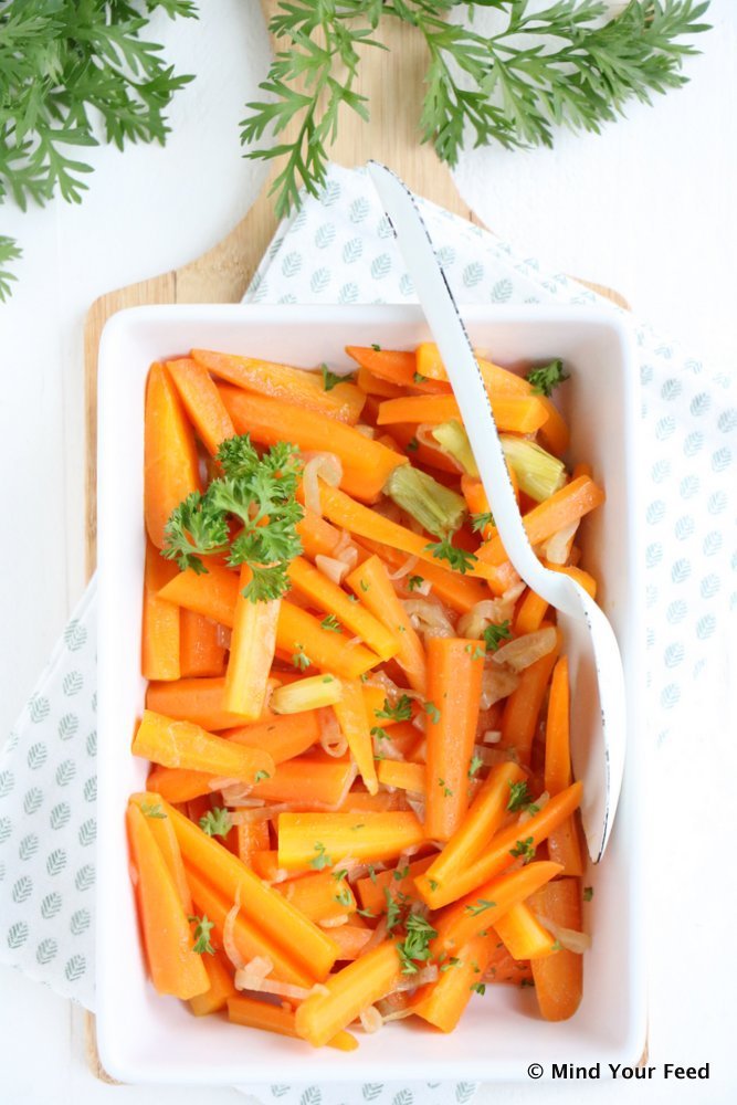Deze geglaceerde worteltjes stonden bij ons tijdens Kerst op tafel. Niet door mij klaargemaakt toen, maar oh wat waren ze lekker! Kijk, zo krijg ik dus inspiratie om zelf aan de slag te gaan. Ik eet ergens wat en dan wil ik het zelf ook maken. En zo gebeurde dus ook met deze oranje vrienden. Ik eet regelmatig wortels namelijk, maar eigenlijk vooral als rauwkost. Of ik gebruik een winterpeen, maar die gaat dan dóór een gerecht heen. Nu maakte ik deze veggiesklaar als bijgerecht, en zo zet je dus super simpel een extra portie groenten op tafel!