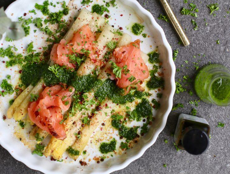 Gegratineerde asperges met parmezaanse kaas en peterselie olie