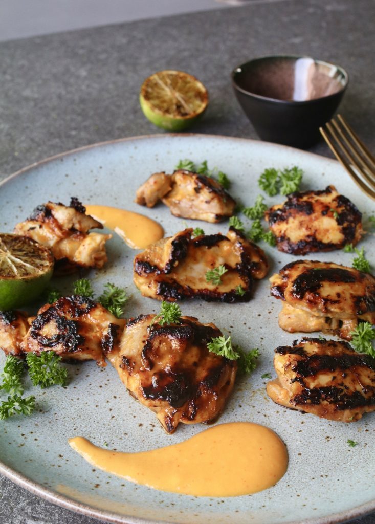 Vorige week ging ik aan de slag met een aantal lekkere recepten voor op de barbecue. Ik ben fan van groenten en gepofte (zoete) aardappels met zure room, maar een lekker kippetje hoort er ook bij. Ik vond op Pinterest een fantastisch recept voor een super smaakvolle mango limoen marinade. Deze marinade heeft alles wat je wilt. Een zoetje, een zuurtje en wat pit. Dat beetje pit komt van sriracha, oftewel hete chilisaus. Je koopt dit gewoon bij de supermarkt (in ieder geval bij de AH) en het is zeker de moeite om een flesje aan te schaffen. Je kunt er namelijk ook heerlijke dips en andere marinades mee maken.