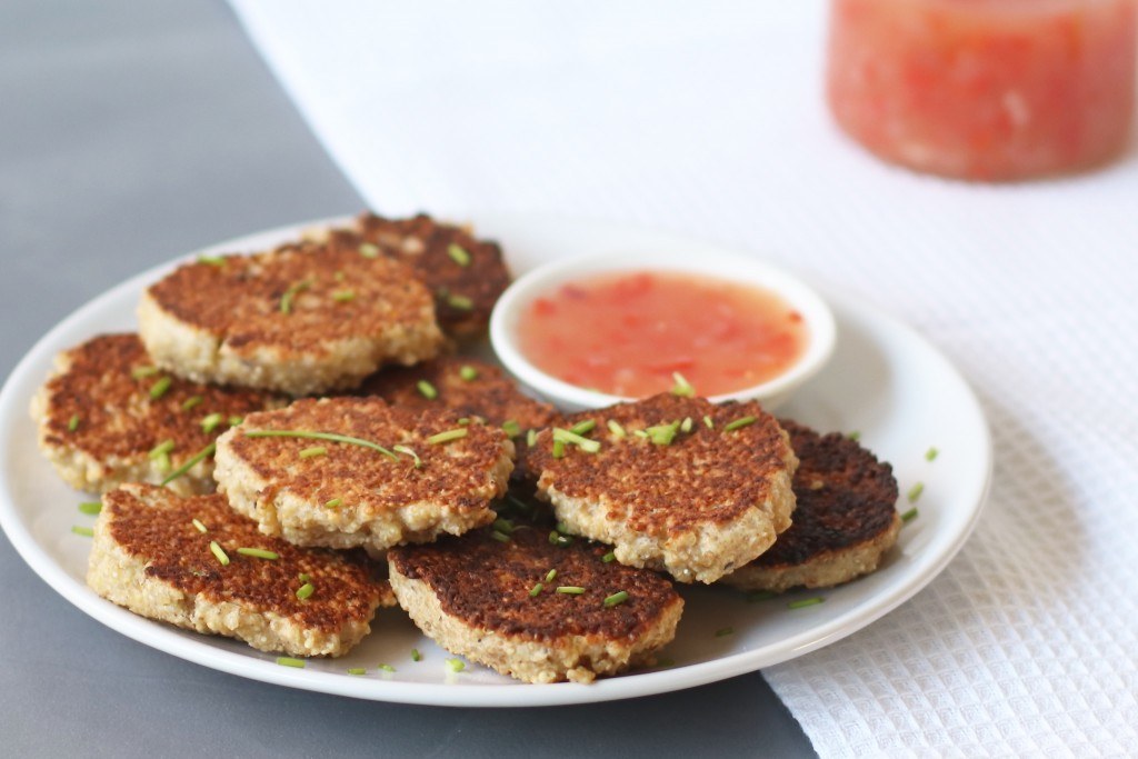 Als variatie op de niet zo gezonde kipnuggets maakte ik een veeel gezondere variant van geitenkaas en quinoa. Het enige dat kipnuggets en mijn geitenkaasnuggets met elkaar te maken hebben is dat het nuggets zijn en dat ze op hun best smaken wanneer je ze doopt in een lekker sausje. Het verschil is dat deze geitenkaas nuggets echte gezonde bommetjes zijn doordat ik ze maakte met Hollandse quinoa, geitenkaas, een beetje havermout en een eitje. Vier ingrediënten maar dus en vegetarisch! Omdat een sausje niet kan ontbreken maakte ik er ook een lekkere chilisaus bij. Zónder geraffineerde suiker. Voor deze nuggets heb je ook geen frituurpan nodig want je bakt ze gewoon in een koekenpan.