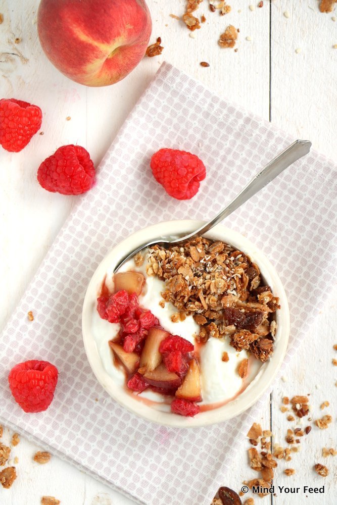 Hmmm, zou dit nou een ontbijtje zijn, of een toetje? Eigenlijk kan het gewoon allebei vind ik... Want om met deze gekarameliseerde perzik met yoghurt en granola de dag te starten, dat zie ik wel zitten hoor! Sowieso, de dag beginnen met vers zomerfruit, daar zul je mij niet over horen klagen. En nu we hier vakantie hebben, kan ik in de ochtend weer wat meer tijd besteden aan mijn ontbijt. Niet dat het heel lang duurt om dit schaaltje met geluk in elkaar te zetten, maar op een doordeweekse dag gun ik mezelf de tijd toch ook niet voor het klaarmaken van een verwenontbijtje. Lang leve de vakantie!