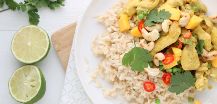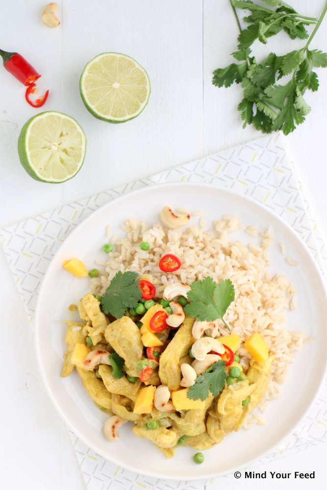 Joepie, de zon schijnt! Oh wat heerlijk zeg, ik krijg gelijk helemaal lentekriebels.Deze tijd van het jaar maakt mij altijd zo vrolijk. Zodra ik kan, ben ik buiten te vinden. Alsof ik weer een beetje wakker begin te worden uit mijn winterslaap… Ik krijg weer meer energie en ik kan ook altijd zo genieten van alles wat nu begint te bloeien en te groeien. Laat dit nu alsjeblieft doorzetten, want ik ben klaar met regen en kou. En met autoruiten krabben ook trouwens. Ik ben toe aan voorjaar, en aan weer wat frissere gerechten. Zoals deze gele kokos curry met kip, mango en cashewnoten!