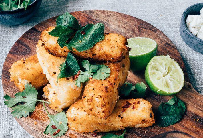 Het maken van de gepaneerde feta repen is vrij simpel. Eerst zorg je voor een laagje van ei dat er voor zorgt dat de broodkruim aan de feta blijft plakken. Het broodkruim kun je maken van oud brood. In het hakmolentje van de staafmixer heb je er heel snel broodkruim van gemaakt. Je kunt aan het broodkruim een smaakje toevoegen. Meng het met wat zeezout, peper en chilivlokken (of verse kruiden als tijm en rozemarijn gaat ook heel goed).