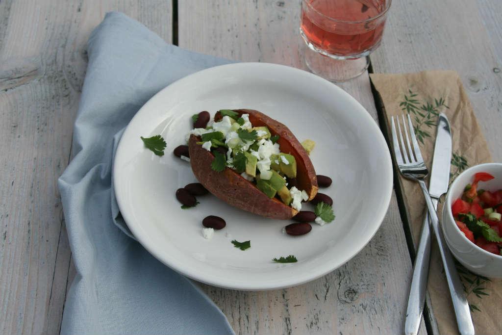 Nu stond een 2e barbecue op het programma bij een kinderverjaardag. Ik heb de gepofte zoete aardappel met bonen en pittige salsa meegenomen, terwijl de rest aan het barbecuevlees zat. Het ideale is dat je een gepofte zoete aardappel kunt vullen met allerlei lekkers. Ik ben gek op peulvruchten. De eiwitten hierin zijn een goed alternatief voor de dierlijke eiwitten uit vlees. De rijpe avocado zorgt voor een goede portie vetten en de feta is een heerlijke smaakmaker. Kant en klare sausjes zijn nu natuurlijk uit den boze. Een flinke link chilisaus lijkt mij er zalig bij. Nu heb ik een pittige tomatensalsa gemaakt die ook zeer goed smaakt bij de vulling van de gepofte zoete aardappel.