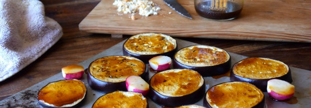 Dit groentegerecht is voldoende als hoofdgerecht voor 1 persoon, met bijvoorbeeld een portie quinoa erbij. Je kunt het ook gebruiken in een salade met kip voor twee personen. Bestrijk in dat geval de kipfilet (150-200 gram voor twee personen) met dezelfde saus als de aubergine, en rooster de kip mee in de oven tot die gaar is. Snijd de kip daarvoor even in op het dikste punt; hij mag niet roze meer zijn.
