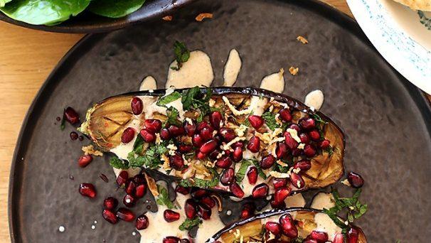 Verwarm de oven voor op 200 graden. Snijd de twee aubergines verticaal door zodat je vier helften krijgt. Snijd het vruchtvlees kruislings in, zodat je een soort diamant-patroon krijgt. Leg de aubergines in een ovenschaal met de open kant naar boven, en besprenkel ze met flink wat olijfolie (wrijf het er goed in met je schone handen).