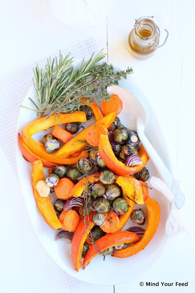 Wat een mooierds, deze paarse spruiten! Die mogen wat mij betreft dan ook niet ontbreken in het kerstmenu van dit jaar. Ook met Kerst zet ik graag extra groenten op tafel. Sterker nog, ik zet het liefst zoveel mogelijk veggies op die mooi gedekte tafel. En dan laat ik de echte vullers achterwege... zo blijft ook de kerstmaaltijd nog redelijk licht. Wel zo fijn, want het nagerecht dat ik je dit jaar serveer daar moet je echt een plekje voor bewaren. Deze geroosterde paarse spruiten maakte ik klaar met pompoen, wortel en Italiaanse kruiden.