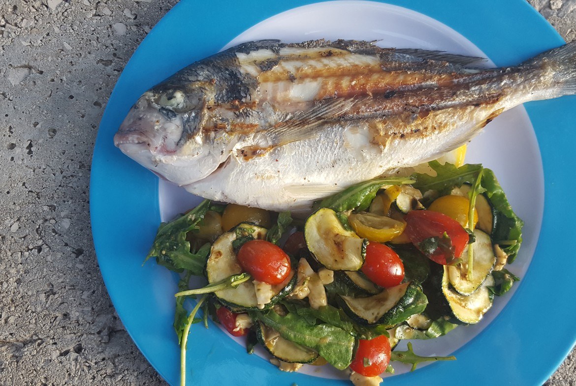 Wij maakten deze vis op de camping op een grill klaar, je kunt dit natuurlijk ook gewoon in de tuin op de barbecue doen :) Het leek me leuk om een gerecht te delen wat wij makkelijk klaar maken op een camping, hopelijk biedt dit ook wat inspiratie voor jullie. Lekker en gezond hoeft helemaal niet ingewikkeld te zijn! De courgette grill je namelijk ook en meng je daarna met andere groenten tot een heerlijke salade. Omdat wij dit op vakantie aten, zien jullie een camping bordje en foto's genomen met de telefoon. Ach, heeft ook wel wat toch?