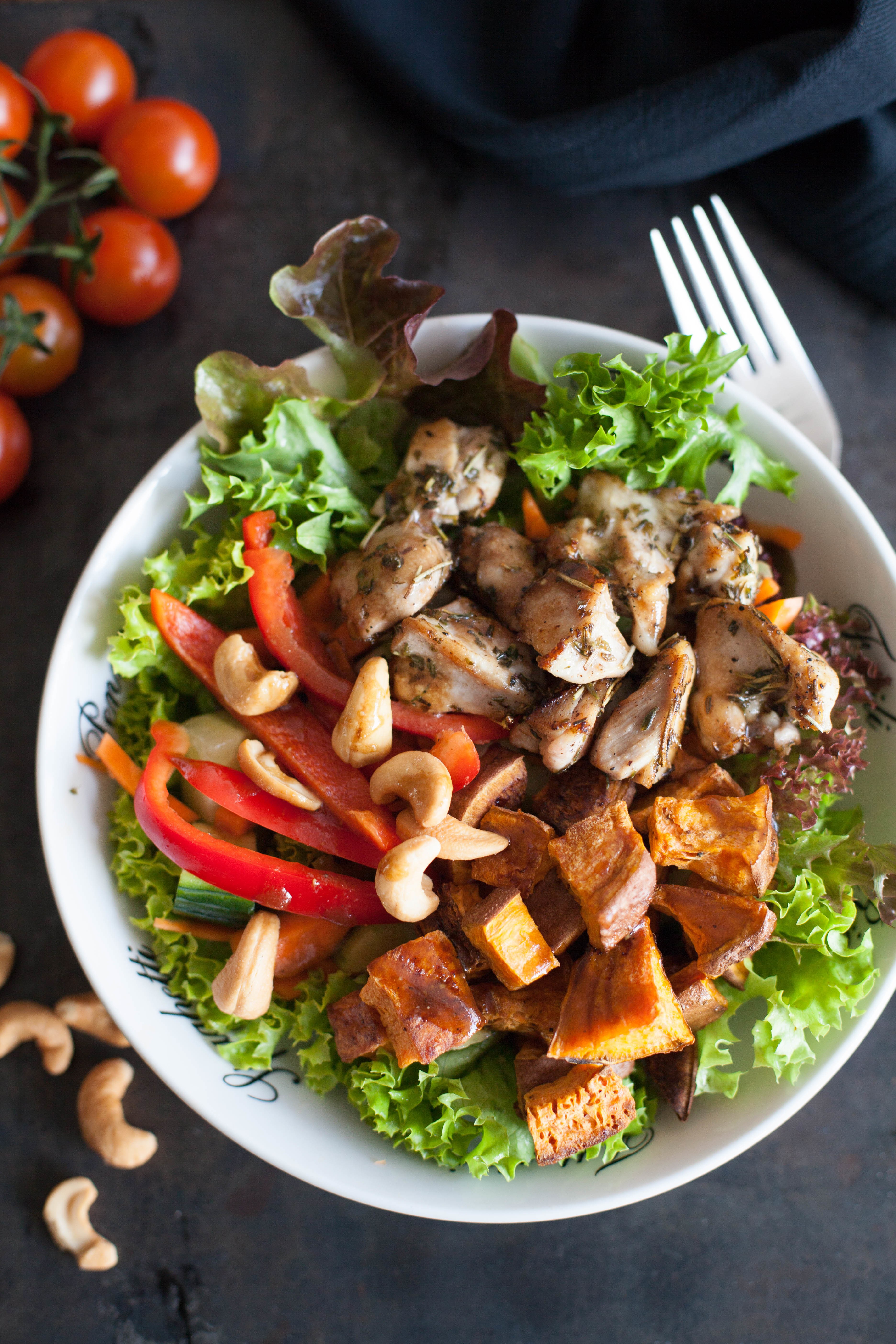 Deze geroosterde zoete aardappelsalade met kip misleid je door haar eenvoud. De combinatie van smaken zal echter een aangename smaakvariatie geven aan je salade-repertoire. Maak de aardappelen in een grotere portie klaar en je hebt gelijk een mooie koolhydraat basis voor de volgende dag.