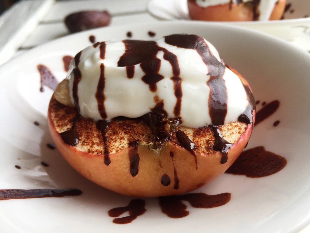 Dit heeeerlijke en easy recept maakte ik een tijdje geleden voor Lekker eten met Linda. Dit is zo'n fijn gerechtje voor na het eten, als je zin hebt in een toetje maar niet wilt toegeven aan ijs. Dit dessert is ook leuk om te maken wanneer je eters hebt. Je kunt de appeltjes van te voren vullen zodat je ze alleen nog even in de oven hoeft te schuiven voor het opdienen. Toef kwark eroverheen, wat gesmolten chocolade en je hebt een gezond toetje wat oogt als een heerlijke dame blanche!