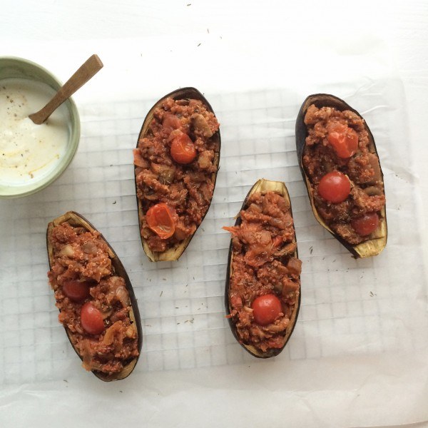 Gevulde aubergine met quinoa en een yoghurtsausje