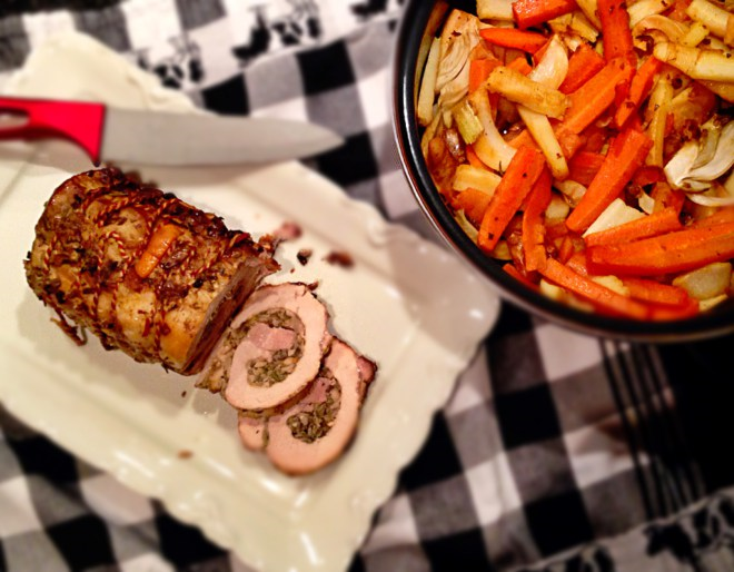 Stiekem, heel stiekem, had ik dit gerecht vorig jaar al gemaakt. Op de een of andere manier is het er toen niet van gekomen het voor kerst online te zetten. Nu kwam ik de smakelijke foto's ineens tegen en dacht me nog te kunnen herinneren waar het recept vandaan kwam. Yes! Ik had het juiste Jamie magazine te pakken en vond het recept voor deze overheerlijke kalfsrollade gevuld met champignons en geroosterde groenten ernaast. Heerlijk met kerst, maar ook dé manier om een gewone zondag speciaal te maken.