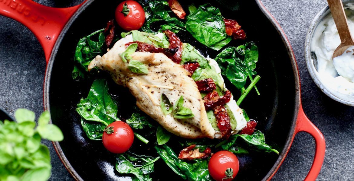 Gevulde kipfilet uit de oven met roomkaas en spinazie