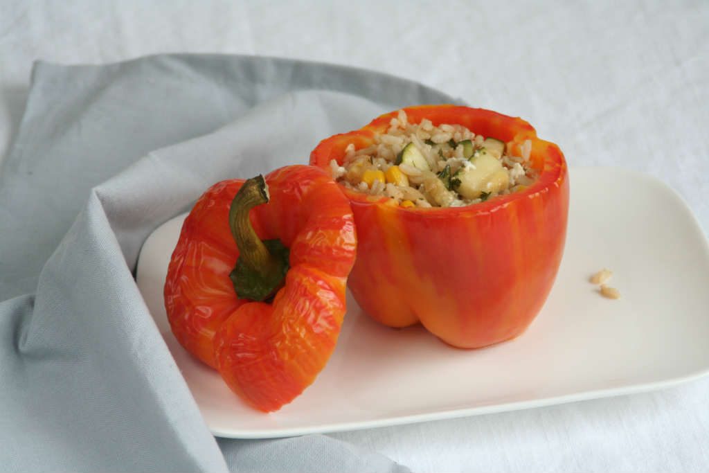 Deze paprika vraagt erom om in zijn volle pracht op tafel te zijn. Vandaar lekker ouderwetse gevulde paprika's met rijst en groente. Het groen van de courgette en geel van de mais zorgen voor extra kleuren accenten.